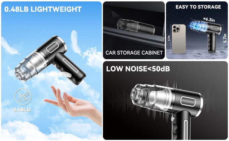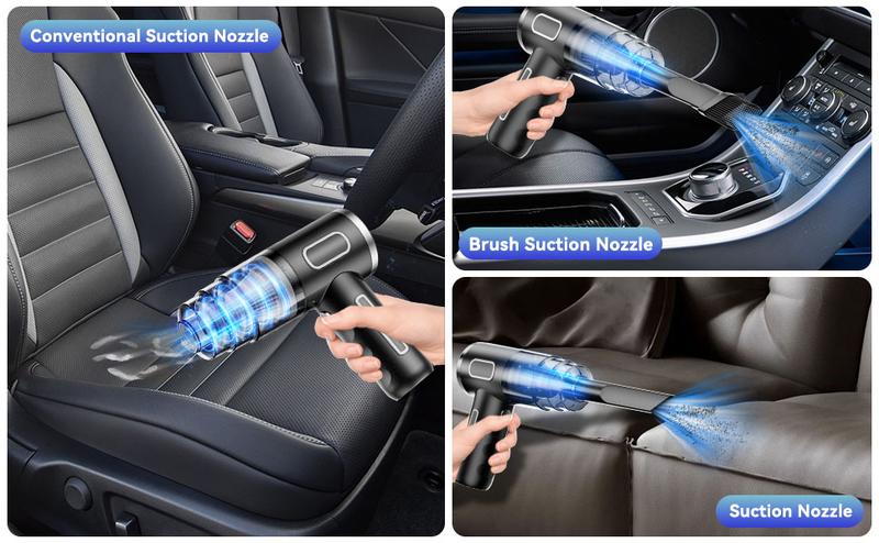 [3-in-1 Car Vacuum Cleaner] Handheld vacuum cleaner with 7 accessories can be used for sucking, blowing and inflating in 3 modes to meet your different usage scenarios. The floor brush and nozzle brush can easily pick up all kinds of debris. The blowing nozzle can be used to blow away dust from keyboards and narrow crevices. Two sizes of universal nozzles to quickly inflate or expel air from objects such as swimming rings, mattresses, etc.