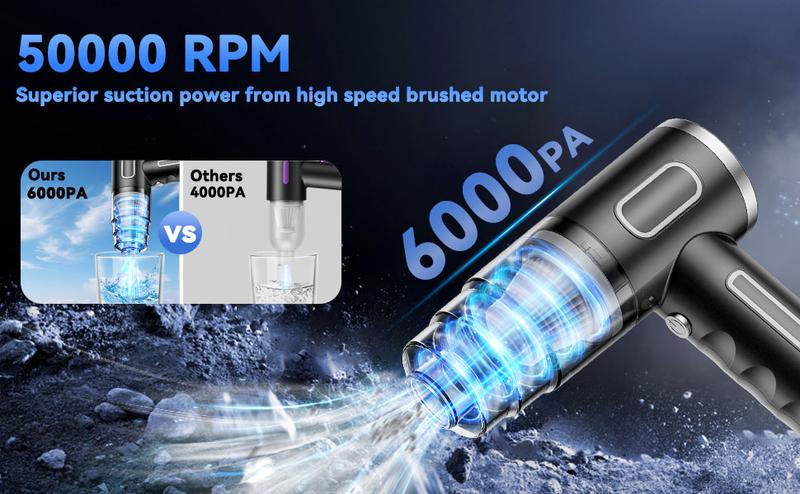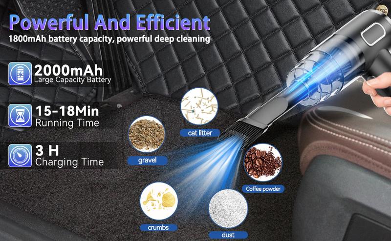 [POWERFUL 12,000PA SUCTION POWER] The handheld vacuum cleaner's powerful motor spins at 56,000RPM and delivers up to 12,000PA of suction power. Whether it's the sofa or carpet in your home or the interior of your car, it's easy to clean. The quick cooling feature dissipates heat in no time, making the motor more durable and long-lasting. The operation sound is as low as 50dB, so you can clean quietly without disturbing others.